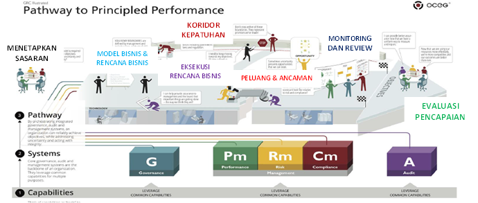 Model integrasi GRC secara literasi salah satunya dimunculkan oleh OCEG (Open Compliance & Ethic Group), organisasi nirlaba yang berbasis di USA, dengan mengusung konsep GRC Capability Model. Konsep GRC Capability Model mengilustrasikan tahapan-tahapan organisasi mencapai pridikat “Principled Performance”, dengan melakukan sinergi penerapan komponen GRC hingga mampu terintegrasi.